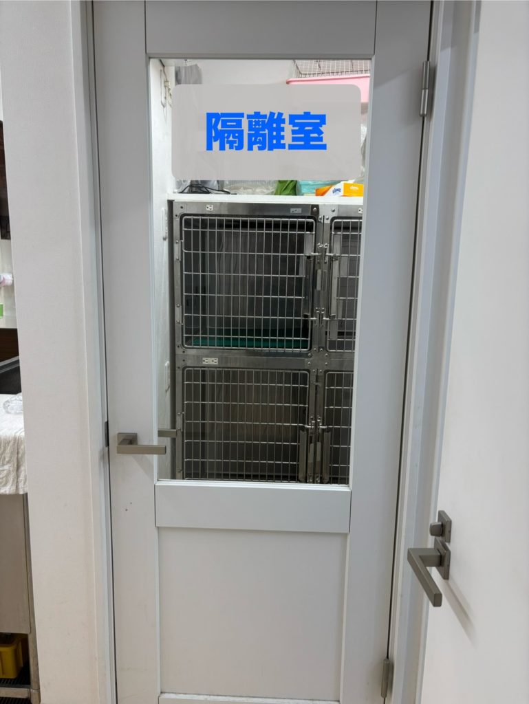 このお部屋は院内感染を予防するために感染症の子や、やむをえない理由でワクチンを接種していない子、ノミやダニなどかついてしまっている子たちを他の子たちと接触させずに管理するお部屋です。