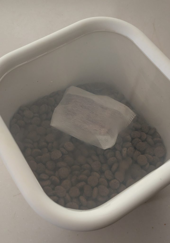 小さめの保存容器に数回分のフードを移し、出汁パック(お茶パック)の中に匂いが強い食べ物(例えばかつおぶしや細かく切ったジャーキー、他メーカーのドライフード)を入れ、しっかり中身が出ないようにしっかりと封をして先ほどの小分けしたフードの中に入れておくだけです。たったそれだけでと思いますが、実際にやってみると明らかにフード自体の匂いが変わっているのが人でも分かります。