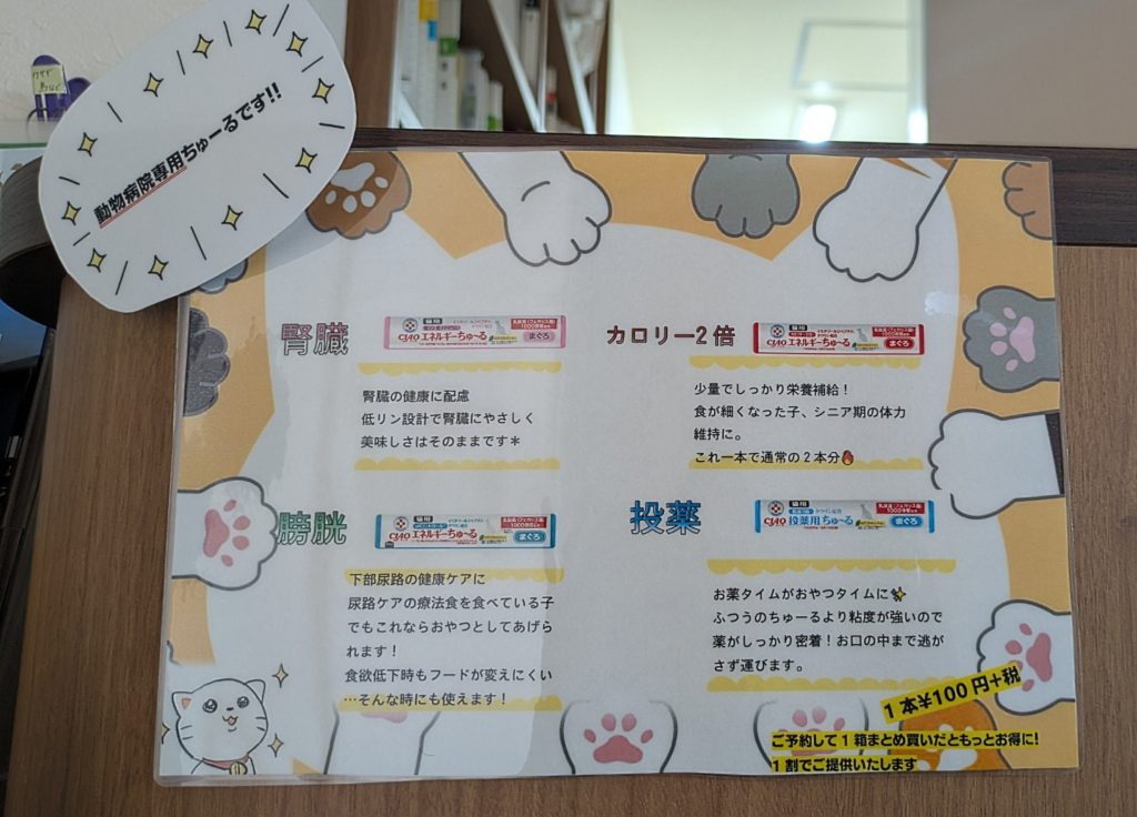 療法食等で食事内容に制限がある子も居らっしゃると思いますが、療法食の中にはドライフードだけでなくウェットフードがある種類もあります。また、当院ではねこちゃんに多い尿石症に配慮した「pHコントロール」や腎臓や心臓へ配慮されている「低リン低ナトリウム」動物病院専売ちゅーるもご用意しております。